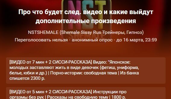 NstShemale – Сисси-Трейнеры, Гипноз, Мотивация на Русском 🔒 Официальный сайт | Сисси-мотивация (sissy trainers, hypno, lesson, tranny made), истории, уроки, гипноз. Русскоязычное сообщество для shemale, tranny.